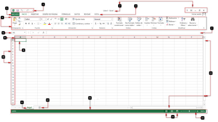 3. Insertar una imagen de la ventana de Microsoft Excel 2016 con cada una de sus partes y dar una breve explicación de cada una de ellas